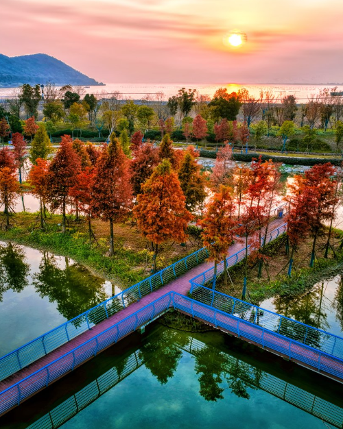 亮点:夕阳西下,湿地公园内的水杉林披上金色外衣;偶有水鸟掠过水面,构成一幅动人的生态画卷。适合喜欢自然风光的安静爱好者。