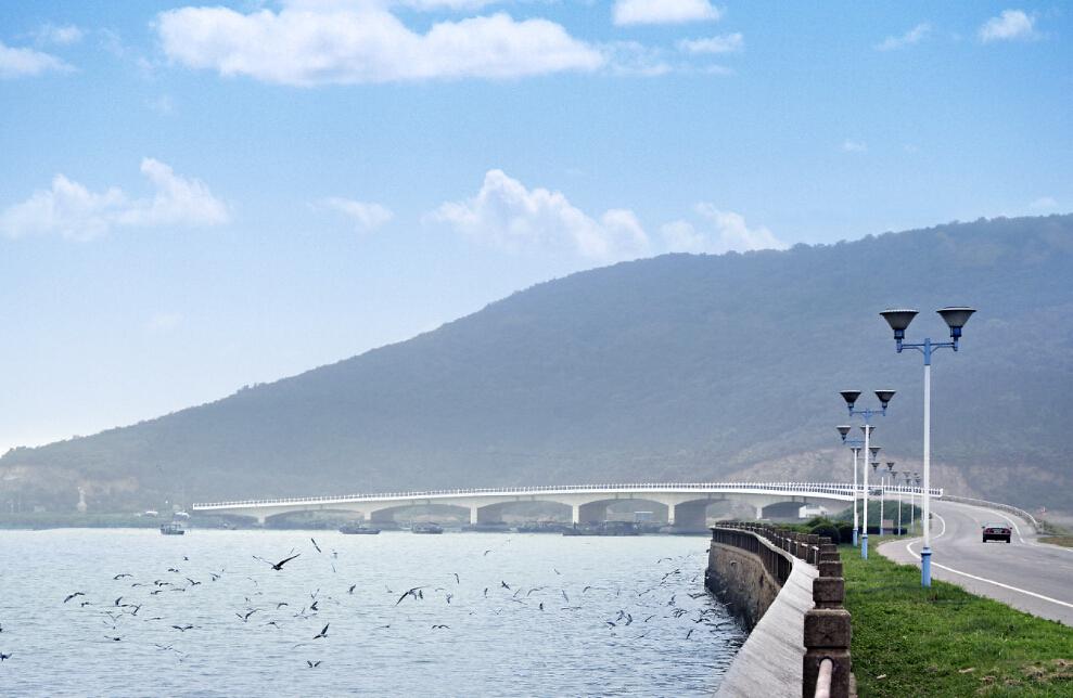 穿越绿色的十八湾进入度假区,我们来到十里明珠堤。这里给人豁然开朗海阔天空之感。细心的人们一定会发现,大堤的东侧靠湖边一面,每隔300多米便多了一处小小的观景平台。十多平方米的铺装里,两三张厚实的长条木凳,加上垃圾桶,给了经过长途跋涉来到这里的人们下车休憩观景的好地方,挡浪墙上新安装了开放式栏杆,给人以安全感。人们手抓扶栏极目浩淼太湖,气象万千,心旷神怡,身旁的香花草木美不胜收,挡浪墙边上有一米宽的小道供人信步行走。其中,在天远桥北侧的珍珠馆附近的观景平台最大,适宜团队休息观光。明珠堤南面终端千波桥下增加了停车场,这里更是一个大型观景平台,有别具匠心花团锦簇的园林景观小品,有反映马山历史文化的雕塑。
