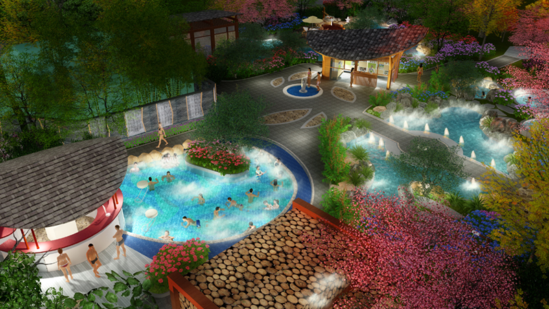 温泉中心配备前台商场1个、鞋吧1个、星光影院1个、棋牌室3间、KTV3间、斯洛克台球1间、健身房1个、男女更衣区、干蒸3个、室内恒温泳池1个、室外无边际泳池1个、私人定制汤屋4间、美容养生泡池4个、药浴养生汤池7个、室内外水疗池3个、亲子游乐池1个、鱼疗池1个、矿砂池1个、石板汗蒸1个,室内外温泉泡池合计23个。