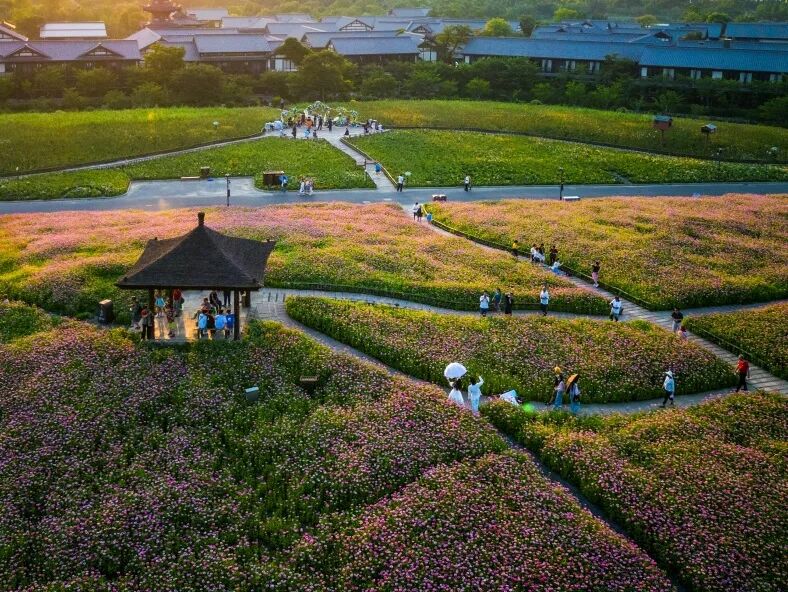 宁静梦幻的“半山衔日”、特色繁华的“香月花街”、浪漫唯美的“梵天花海”、山水相伴的“云树帆影湿地”、生态自然的“鹿鸣谷”以及贯穿小镇的沉浸式演艺“禅行”,形成了一个人文与休闲气息兼具的禅意文化景观群。