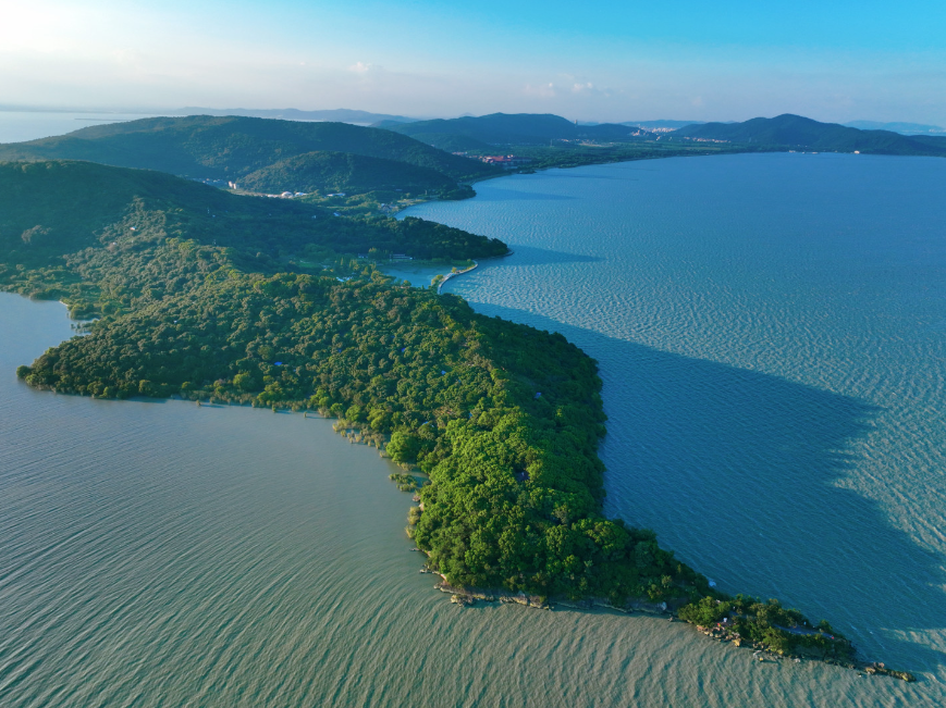马山拥有42公里优美湖岸线,起伏的丘陵地貌,专业级赛事道路,放眼望去,山在湖中,湖绕山行,形成一幅“平山远水”的江南山水画卷。