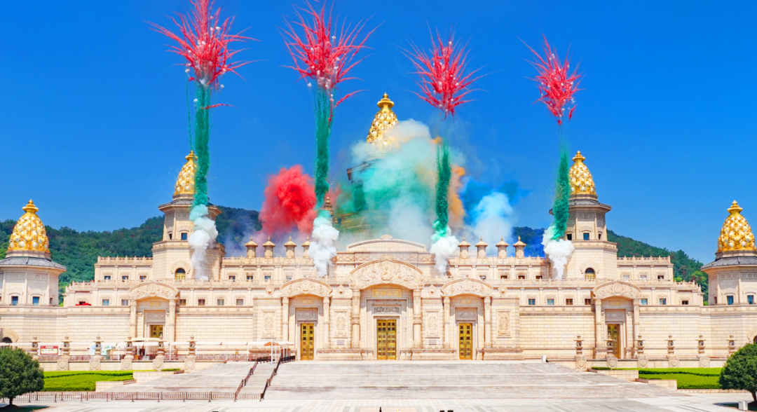 最令人期待的莫过于梵宫白日烟花首秀!不同于夜晚的璀璨,白昼的烟花借助环保彩烟技术,在蓝天之下绽放出七彩烟霞。