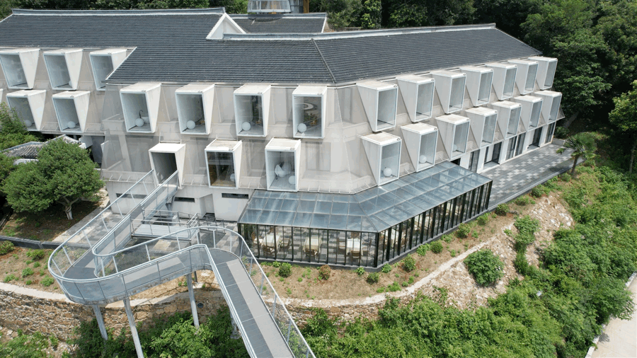 从入口漫步而来,每一处都极具美学主义,整1400㎡的“盒子屋”,从1楼到4楼都是极佳的视野。25间房靠山而立,深深感受“小隐在山林”的痛快。