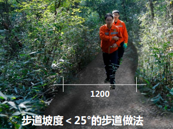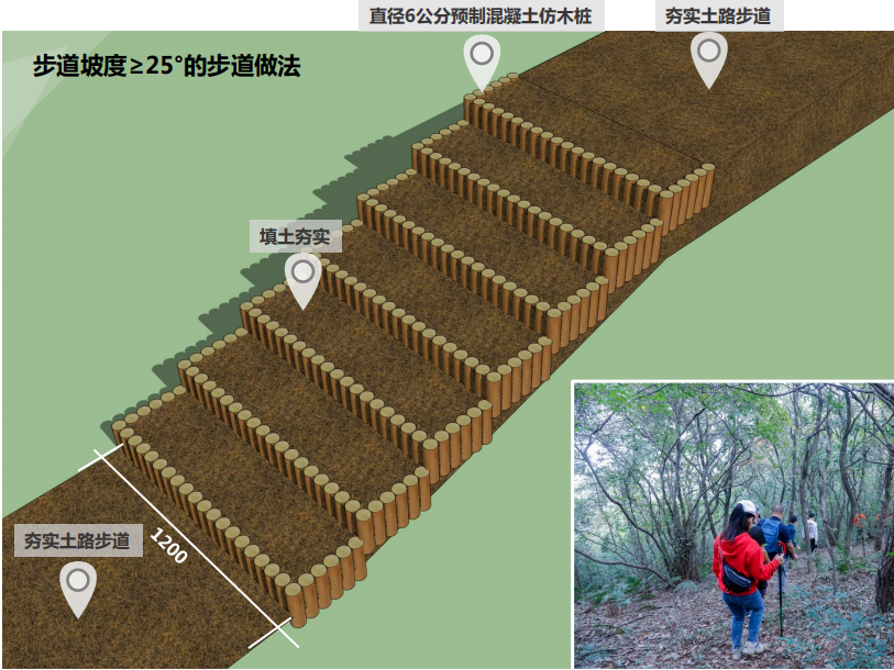 步道做法设计:步道坡度小于25度路段,保持现状土路,修整路宽至1.2m,且两侧各保持0.3m路肩。1.2m路面及0.3m路肩,人工夯实。步道坡度大于等于25度路段,建设仿木桩步道台阶。