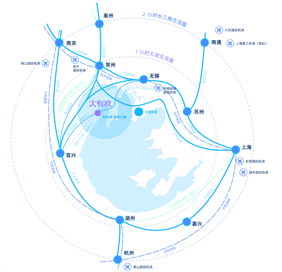大有秋位于太湖之滨、宜兴市周铁古镇,地处长三角都市带、太湖湾科创带核心区,与灵山胜境、拈花湾隔湖相望,水陆交通四通八达。得益于其优越的自然条件和独特的地理位置,大有秋将在苏州、无锡、常州形成1小时太湖生态圈,覆盖上海、杭州、南京、南通、湖州、嘉兴、泰州等多个城市,形成2小时的长三角生活圈。