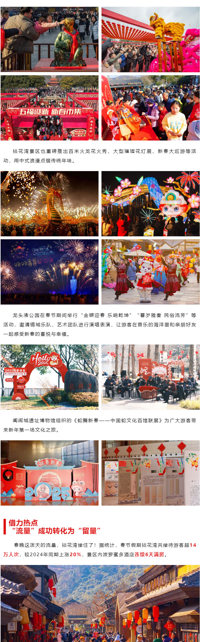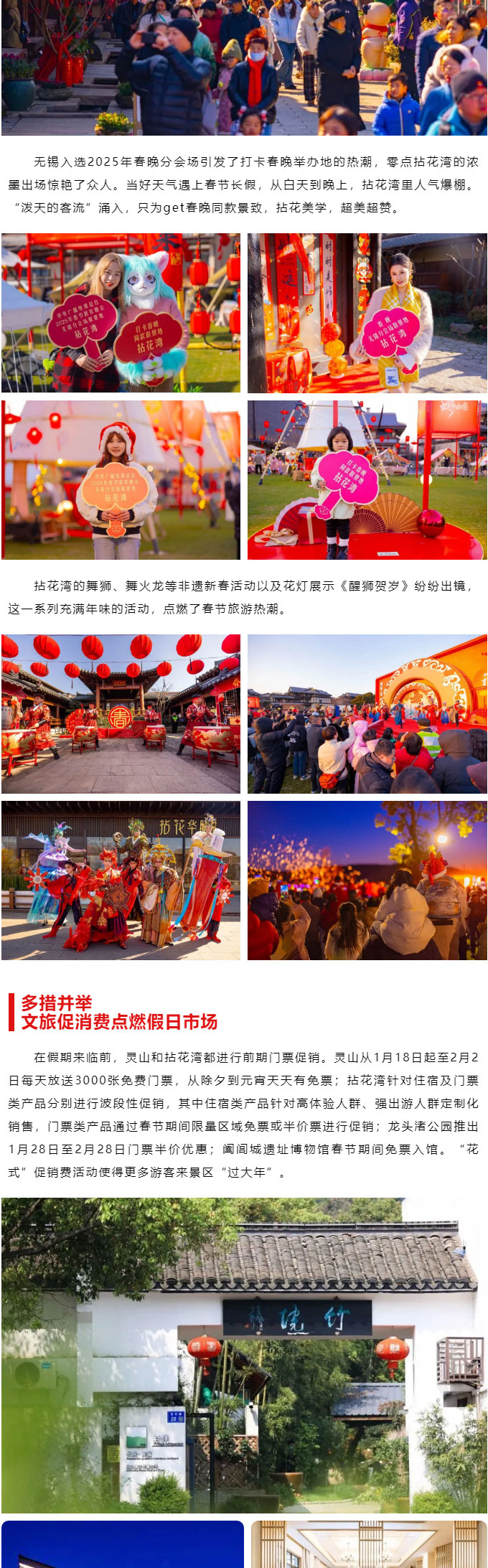 除夕当晚,灵山跨年夜的无人机烟火秀再次震撼亮相,璀璨升级。1月28日至2月4日春节期间,千米巡游迎梵宫揖礼蛇、春晚同款舞龙嘘花、新春市集……灵山景区每天活动满满、热闹不停。