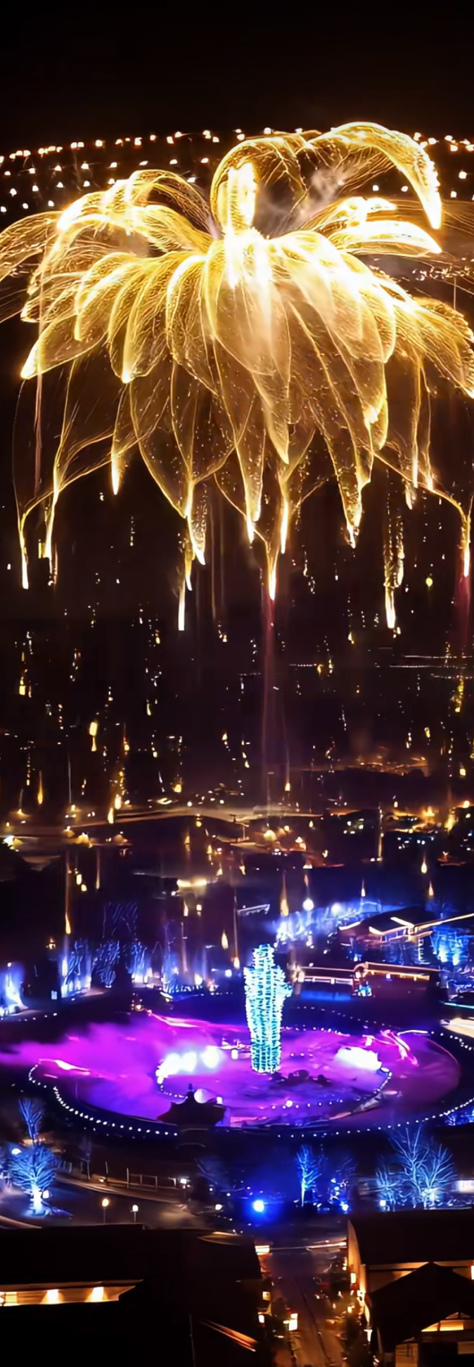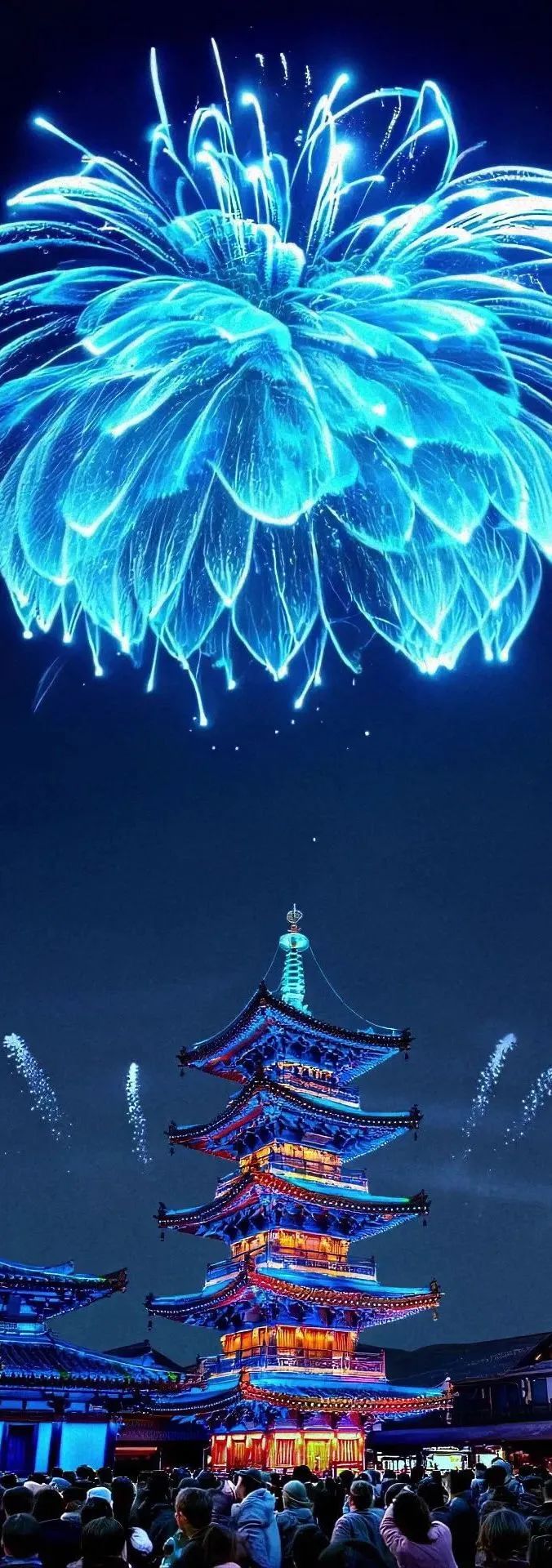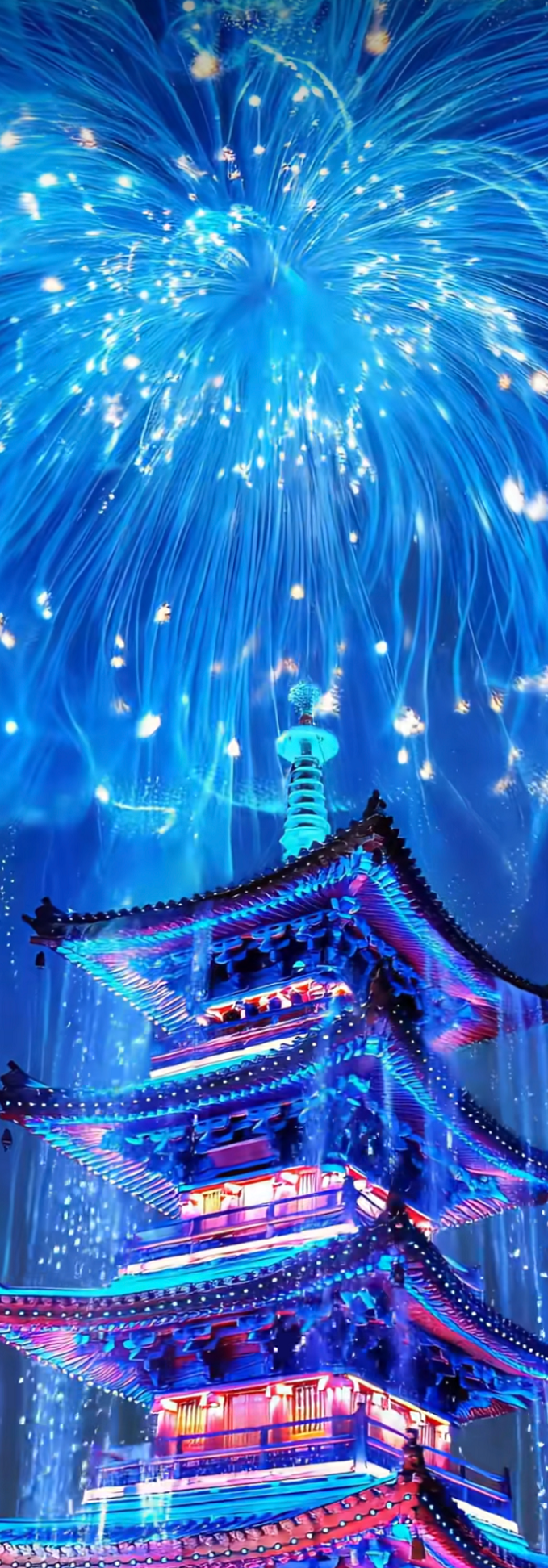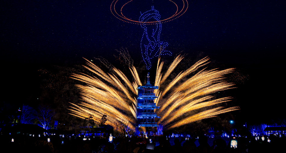 待到夜幕降临,伴随禅音乐声响起,一座参照拈花塔的肌理、高24.75米的AI塔在暮色中亮灯。塔身周边水雾瞬间幻化为立体画卷,各种场景随音乐节奏流转。随后1500架无人机以塔为轴,在夜空中执笔:时空之环下,拈花一指从夜空中缓缓降下,触达塔尖刹那,巨大的蓝莲花焰火瞬间触发,在塔顶绽放,蓝色焰火如星河般倾泻而下,与地面升腾的银色烟花交汇,如星雨坠落,当星雨余烬仍在半空流转,万千光点骤然升腾重组,在云端晕染出流动的诗意宣言——“拈花一笑,为你花开满城”。精彩纷呈的场景引得无数游客驻足观赏。