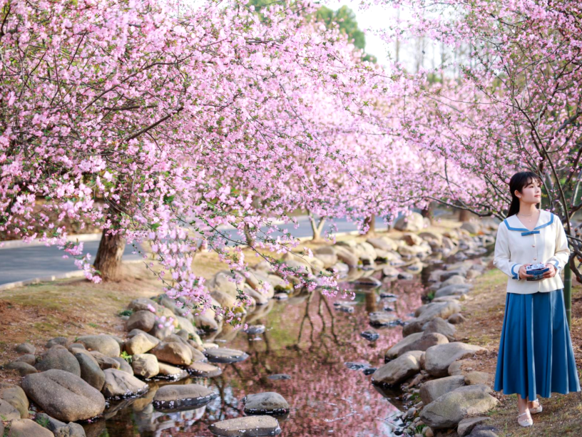 灵山花海漫行:三圣殿前牡丹盛放,国色天香映衬古刹飞檐;百米樱花大道晚樱如云,落英拂面间禅意盎然。游客们漫步花海,拍出的古风大片将“满山春色装进了口袋”。