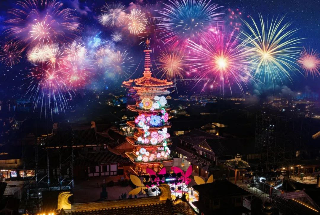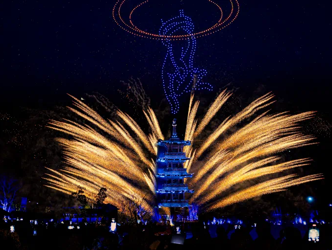 这座高24.75米的建筑,以地标拈花塔为原型,融合1500架无人机编队与数字烟花技术,将虚拟场景复刻至现实:塔身水雾幻化立体画卷,无人机执笔绘出“时空之环”,触抵塔尖的瞬间,蓝莲花焰火如星河倾泻,与银色烟花交汇成“星雨坠落”,最终凝聚为“拈花一笑,为你花开满城”的云端宣言。