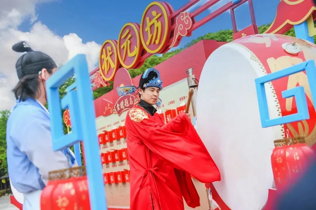 学子专属福运:清明假期期间,“状元祈福树”上缀满朱红丝带,学子们写下“金榜题名”“考试必过”等心愿;状元坊美陈中,击状元鼓、点朱砂、领福签等互动活动吸引着亲子家庭踊跃参与。
