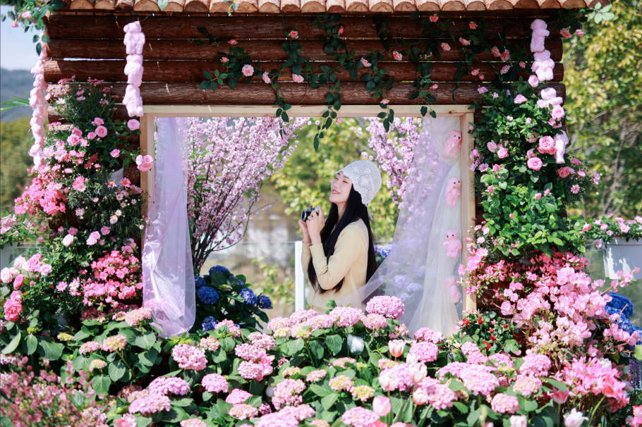 在如一味咖啡馆的二楼,有着一处梦幻打卡点,假期中的游客一脚踏入,仿佛遇见了现实版的“莫奈花园”,品一杯咖啡,出片率100%。