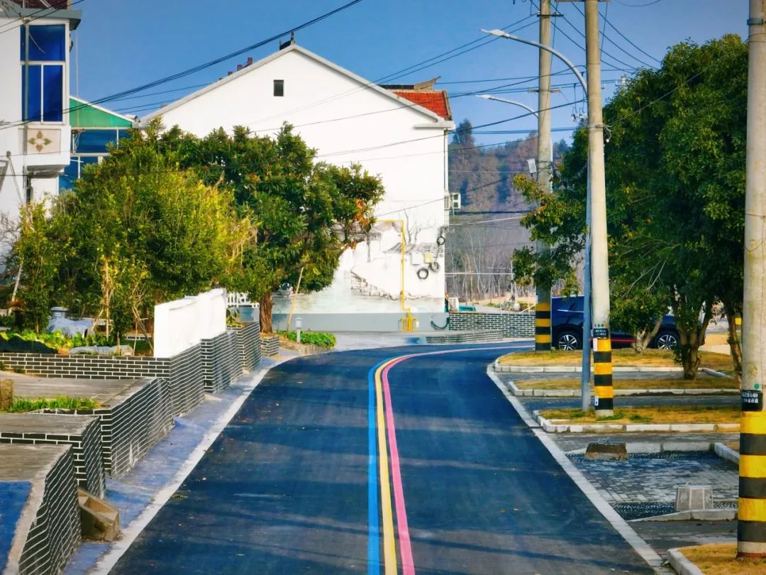 漫步和平社区,除了白墙黛瓦的农家宅院,就是清新的空气,还有绿油油的山林、田地、茶园。崭新的沥青路面上喷涂着红、黄、蓝三色交通标线,远远望去如同彩虹一般,串联起沿线的乡村美景。