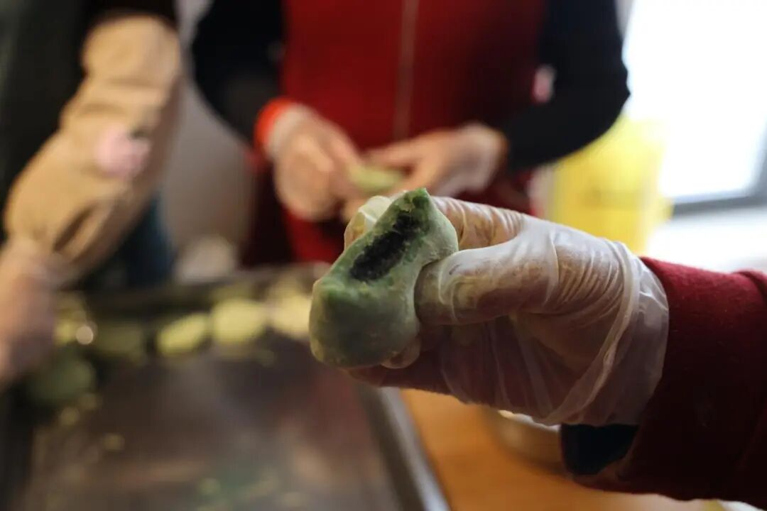 “走啊,一起包松花饼去。”美味的松花饼是市级非物质文化遗产代表性项目,也是马山传统的味觉记忆。春分后,松花穗缀满枝头,采摘晾晒两日,轻捻便得细腻花粉,这是饼的“灵魂”。以糯米粉蒸熟揉团,包入芝麻、豆沙等馅料,再裹一层淡黄花粉,一枚枚承载春日气息的 “春之信物” 就此而成。